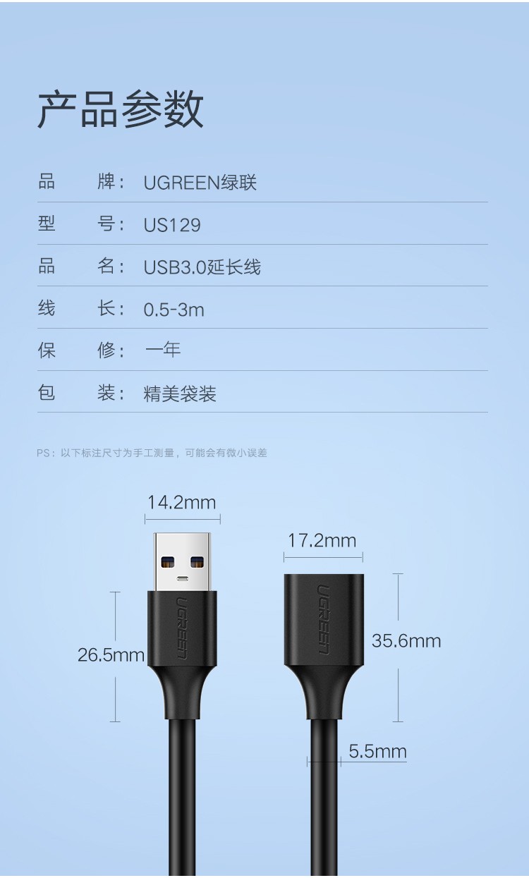 绿联(UGREEN)USB3.0延长线公对母 高速传输数据连...